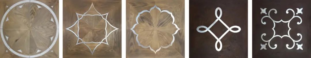 除了人字拼花,盧森地板還將帶來5款意大利手工拼花。這些拼花由大師級工匠以精湛手工技藝制作,表面帶有鑲嵌裝飾。